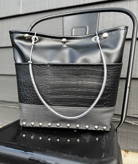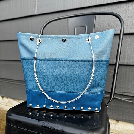 Handmade from marine vinyl makes it a cinch to clean. There are two snaps to keep your goods inside plus a pocket for your cell phone inside. Enjoy the comfortable double handles that fit perfectly under your arm. Measures: 6 1/2x4x8.
